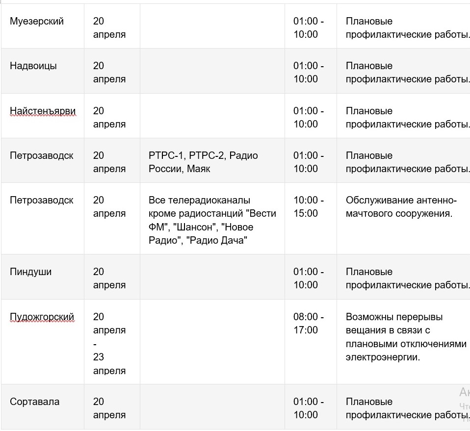 Также отключения телерадиосигнала из-за плановых профилактических работ пройдут 21 апреля в селе Деревянное с 11:00 до 17:00 и 22 апреля с 11:00 до 17:00 в поселке Деревянка
