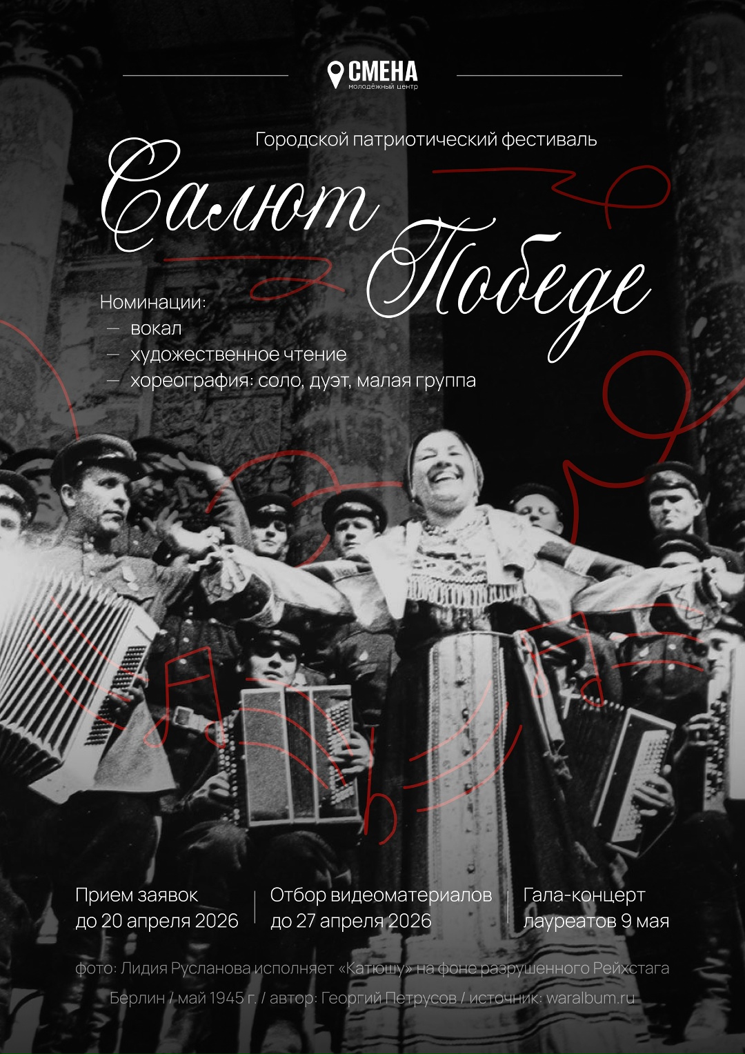 Молодежный центр «Смена» приглашает принять участие в городском патриотическом фестивале «Салют Победе!». Он проводится в трех возрастных категориях: от 14 до 18 лет, от 19 до 25 лет и от 26 до 35 лет.