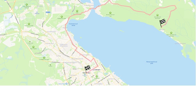 Прямое направление: Железнодорожный вокзал – площадь Гагарина – Государственный университет – Гостиница «Северная» – улица Еремеева – Горбольница – Ленинградская улица – Октябрьский проспект – площадь Маршала Жукова – Мурманская улица – Краснофлотская улица – улица Мелентьевой – улица Зайцева – Петрозаводскмаш – ДСК – Фабричная улица – Кладбище «Пески» – Микрорайон «Пески» – Аэропорт «Пески» – улица Фёдора Тимоскайнена – Ялгубское шоссе – Зимник.
