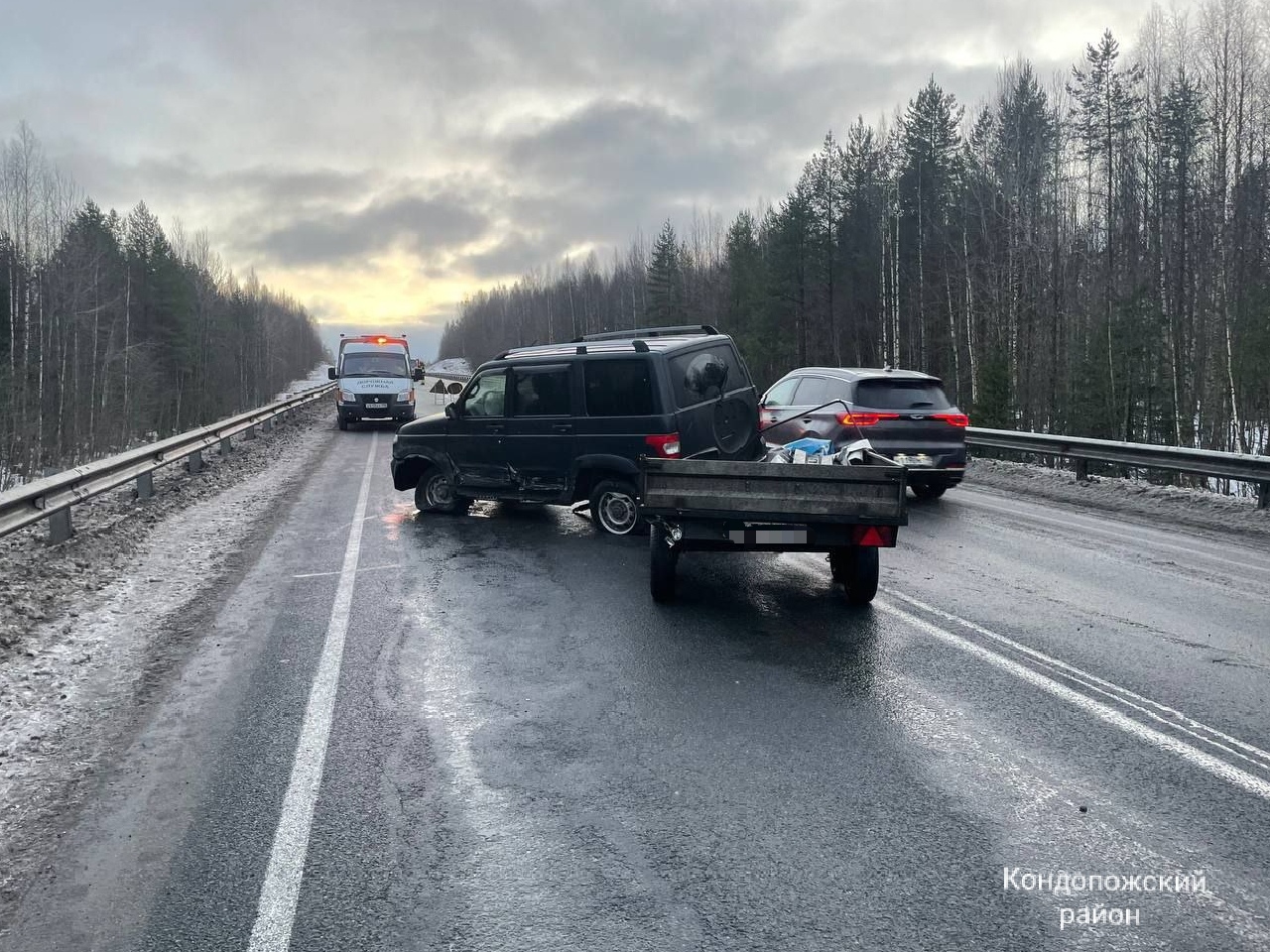 На 567км автодороги «Кола» в Кондопожском районе авария произошла в 13:30. По предварительным данным, водитель «Ford Fiesta» выехал на встречную полосу и столкнулся с «УАЗ Патриот» с прицепом, после чего врезался в барьерное ограждение. В результате ДТП пострадали 68-летний водитель и 66-летняя пассажирка «Ford».