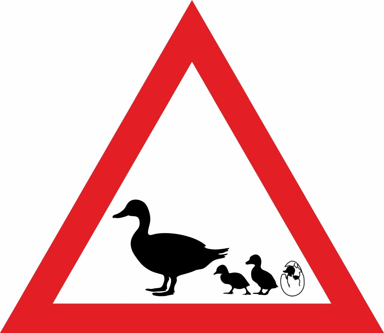 Знак с изображением трёх шагающих уток с красной окантовкой привлечёт внимание водителей и напомнит о бережном отношении к животным и природе.