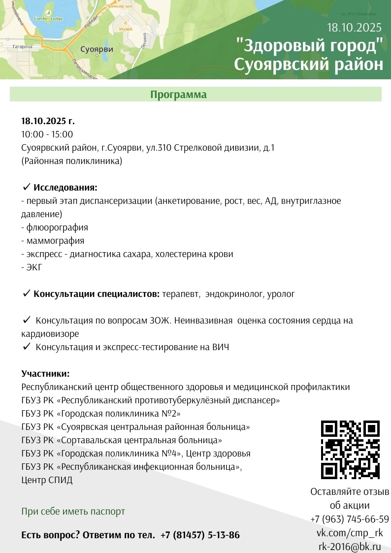 Жителей Суоярви приглашают проверить свое здоровье. 18 октября с 10:00 до 15:00 в районной поликлинике на улице 310 Стрелковой дивизии, дом 1 пройдет медицинская профилактическая акция «Здоровый город», сообщает Минздрав республики.