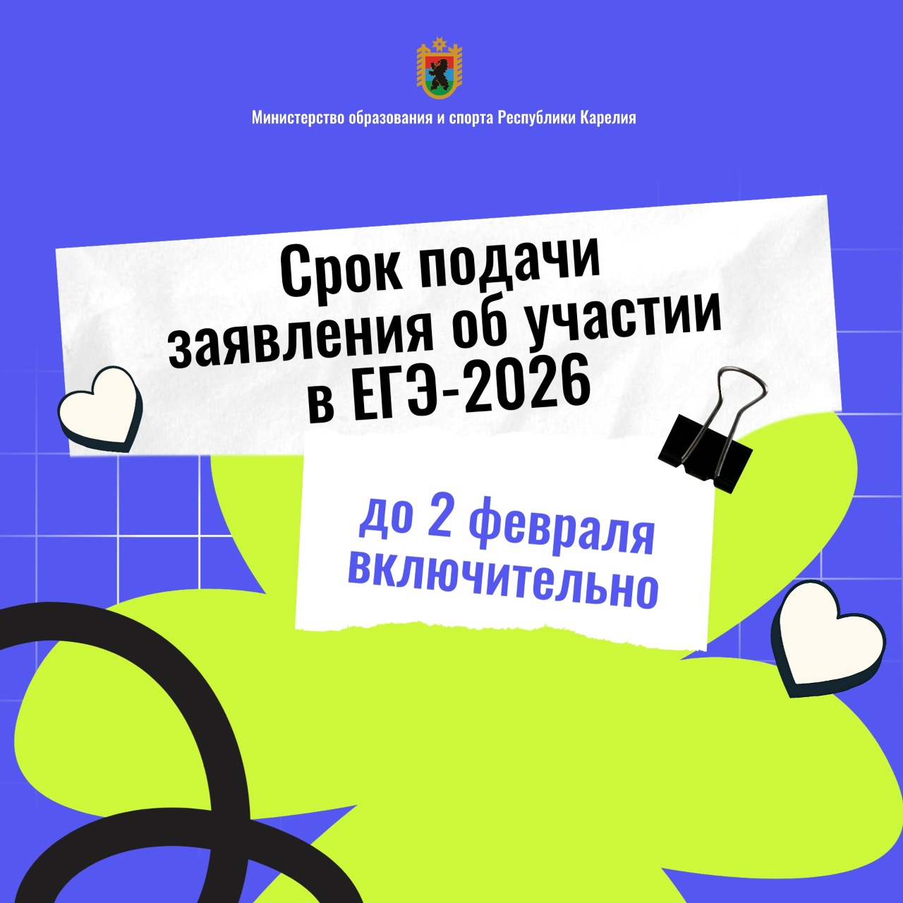 В этом году срок подачи заявления на участие в ЕГЭ-2026 продлевается на один день, поскольку 1 февраля в 2026 году — воскресенье. Крайний срок подачи — до 2 февраля включительно, сообщает Минобразования и спорта Карелии.